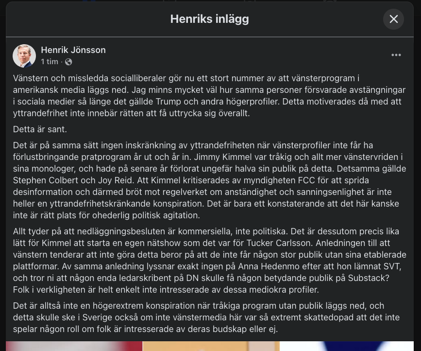 En av många som hedervärt sade ifrån var ledarskribenten Mattias Svensson, på oberoende moderata SvD som bland annat delade en video där den libertarianska tankesmedjan Cato institutet protesterar mot att regeringen försöker tysta Kimmel.8